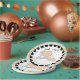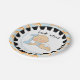 Boy Look Who' 1 first birthday paper plates, great for baby boys turning one year old, features a baby boy in a blue shirt and diaper, text that reads Look Who's 1, a border with a black decorative circle and chevron stripes of orange, white, and light blue, and an area you can customise with a thank you message to guests for attending the party or other text of your choice!