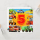 Nine bright colourful trucks surround a great big number 5! Add your own age and name! A green and yellow cement mixer, blue pick up truck, yellow bulldozer, orange dumper truck, red road roller, green tractor and trailer, big red firetruck, yellow digger and a builder's red truck! All kinds of transport, the big trucks that kids love! On a bright blue and yellow background making a very colourful and fun invitation or announcement. Perfect for your fire truck, digger, truck or tractor mad 5 year old on his or her 5th Birthday. Wonderful for your 5yr old's Truck Themed Birthday Party. Kids love Firetrucks, Trucks, Diggers and Tractors and five year olds really love them! Modern children's construction and truck theme birthday party supplies, accessories, party favours and gifts. All designs and truck illustrations © Paul Stickland