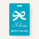 Custom bridesmaid name badges for wedding party. Aqua blue with little bow tie and elegant font. Great for bachelorette party, bridal shower and beautiful weddings. Classy design. Make your own for maid of honor, matron of honor, flower girl, mother of the bride etc. Also handy for other guests.