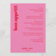 This menu features a bold pink backdrop with modern red typography for a bright, contemporary look. The vertical “bon appétit” adds a stylish graphic element while keeping the layout clean and easy to read. Personalize the wording to match your dinner service and wedding details. A fun, modern choice for couples who love vibrant color.