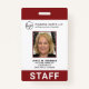 Corporate photo ID badge in a vertical layout. This simple yet professional design features a red /burgundy border on the top and bottom with white in the middle. The template is personalised with your logo, company name, employee name, title, department / location and employee ID. The bottom border has "STAFF" in large bold letters and may be changed to any title desired. The backside has your contact information and instructions for returning if found. This classic design works great for any type of business.