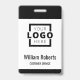 Present a polished and direct image with this high-contrast ID badge design. The minimalist black and white colour scheme features sleek horizontal bars at the top and bottom for a contemporary, framed look. This clean aesthetic places the company logo and employee name front and centre, ensuring a professional and instantly recognisable staff badge.