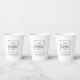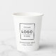 Custom branded paper cups feature your professional business logo design along with custom text that can be personalised with the name of the company, location, slogan, website, or other info. White background and black text colours can be modified. Design appears on the front and back of the cup.