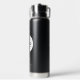 Custom black branded water bottle features your professional business logo design, along with wording for your business name, slogan, website, location, or other information that can be personalised. Simply add your company logo to the white round placeholder image space, and fill in with your preferred wording.