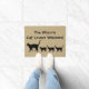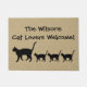"Cat Lovers Welcome" A custom door mat in light brown with a cat lovers theme showing the silhouettes of a mother cat with her kittens. There is a template area to personalise with your name and text.