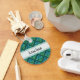 A round key chain of a blue-green Celtic knot repeated diamond tile design against a black background with customisable name in the middle.