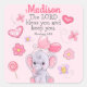 Customisable name and text pastel pink sticker with a cute pink elephant with butterflies, flowers, and hearts, with a blessing scripture "The Lord bless you and keep you."