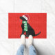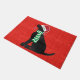 Personalised Festive Christmas Black Labrador Retriever Holiday Dog dressed in santa hat and green and white scarf holding red polka dot christmas ornament in its mouth. Red Burlap Background. Cute christmas doormat for black lab lovers! © EMR Designs.