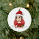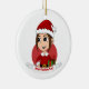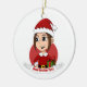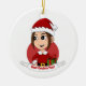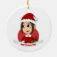 Christmas ornament with an illustration of a cute smiling happy girl with long brown hair, she is wearing red and white Santa Claus costume and holding a present; with editable text template for your name or message, Christmas holidays design
