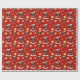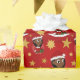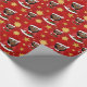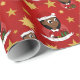 Christmas wrapping paper with an illustration of a cute smiling happy black girl with long hair, she is wearing red and white Santa Claus costume and holding a present; with editable text template for your name or message, Christmas holidays design with a red background