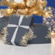 An elegant Christmas tree is on the front of this opulent blue and gold coloured design.