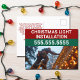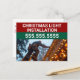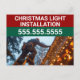Customise your own Christmas light installation business marketing postcards by putting your company name or message in red and green with your phone number above the photograph of someone on a ladder putting up holiday lights in the winter.