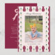 This charming customisable Christmas photo card features a festive burgundy and white striped background and intricate ornaments and bow border. Showcase your favourite family photo add elegance and warmth to your Christmas greetings.