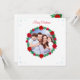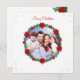 Cute modern custom family photo, pine wreath decorated with poinsettias and snowflakes Christmas Greeting Card. Text ready to be personalised.
