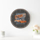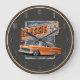 This is a rendering of a orange American classic car with vintage style graphics in the background for a retro look.
