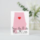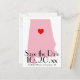 Change the pink background colour to create your own map shape of the state of Alabama. You can easily edit the code in the settings. There are a handful of similiar products in this line where you can customise your own state shape design. Pick your own font style and size to work with your wedding choices. Also you can resize the font to align exactly how you want to bring symmetry to the names and town, date and "Save the Date" text. Right now the sample shows a pretty pink colour with a red heart over the Birmingham area... but the shape graphic easily be moved to account for any town or city.