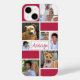 Create your own personalised, custom colour photo cell phone case featuring a colour block design in your choice of colours (shown in magenta rose pink), 7 pictures and your name, monogram or other text in your choice of font styles and colour (shown in modern hand lettered typography). PHONE OPTIONS: The sample is shown on the iPhone 14 model and Barely There case style--other phone models and case style are shown on the ordering page. ASSISTANCE: For help with design modification or personalisation, colour change or resizing for another phone style, contact the designer before ordering via Zazzle Chat or email makeitaboutyoustore@gmail.com.