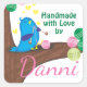 Cute fat blue bird with knitting needles ’handmade with love’ gift tag sticker, product or packaging label for knit and yarn crafts and crafting. Bird sits in a tree with balls of yarn for leaves, knitting from a ball of green yarn.