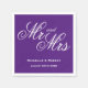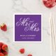 Custom colour background paper napkins. Chic royal purple Mr and Mrs paper wedding napkins. Elegant script typography design for classy wedding party. Stylish handwritten calligraphy text. Customisable colours personalised with name of bride and groom.