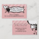 Business card for a personal or private chef, caterer or catering, or other cooking, food, or culinary pro featuring a woman chef with chef's hat, frying pan or skillet, floating hearts and fancy nameplate. Choose your own background colour to your favourite.