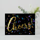 Contemporary classic new years holiday season greeting card with multi coloured and golden confetti fireworks pattern and cute real gold foil Cheers! calligraphy text. With option and room to customise the text, family name, year date and a customisable season greeting message on the backside of the card.