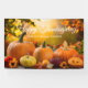 Elegant custom company Thanksgiving party banner with cute autumn pumpkins and fall sunflowers decorating the front underneath your business name and Happy Thanksgiving greeting. Corporate holiday decor for an office.