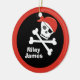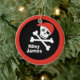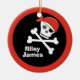 Customised punk pirate Christmas ornament with your name written in white on a black background. Cool skull with a red bandanna and a black eye patch with crossbones underneath.