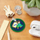 A boy in a cool blue and green superhero costume and cape next to a yellow action bubble personalised with your child's name. An awesome comic book style keychain.