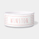 Custom white and coral pink minimalistic modern farmhouse style thin multiple stripe pet food or water bowl with your cat or dog name printed on the side. Use the advanced template editor to change font, background or stripe colours to match your decor or favourite colours.