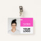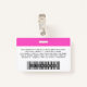 Easily personalise this Custom Employee Name Badge with Photo, Scan Bar Code and business company logo, featuring persons name, occupation, optional identity bar code, with metal clip included. A branded badge useful to identify staff, visitors or guests. A simple business design with large photo in cute feminine neon fuchsia pink and white fully customisable in front and back sizes, in any colour background, sans-serif basic and modern fonts and a professional and clear look. An useful tool for corporate events, reunions, renews and celebrations. Create more corporate photo badge identification card in different colours for any category you need to identify: staff, visitors or guests. Avaiable with or without lanyard, metal clip or with retractable. No minimum order.