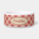 Dark red and cream gingham decorates this cute pet bowl. Customise this bowl by changing the name to suit your needs. The design is from original art.
