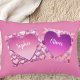 Pillow with two patches with hearts with Customisable names. This is a duo pillow with their names patched together, Perfect for a couple, newlyweds Mr and mrs. Cosy up to this couple Pillow. A perfect wedding gift or other occasions like Valentine's, birthdays or other. Colours in pink and purple with the names in a decorative script font.