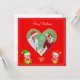 Cute modern custom couple photo inside heart and cute elves on red Christmas Greeting Card. Text ready to be personalised. Photo can be customised,