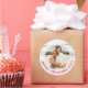 Holiday stickers with photo template and custom, curved text. White snow background and red text with lots of space to include a personal message and use as an envelope seal on seasonal greeting cards.