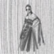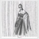 This is a stylish black-and-white fashion illustration featuring a poised woman in a dramatic, off-the-shoulder gown with intricate floral embellishments and a flowing, sheer cape. The background has a striking vertical line texture, adding a sense of depth and movement