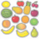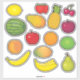Fun collections of small custom-cut stickers featuring various fruits. This set includes fifteen vibrant illustrations of banana, pear, apple, lime, lemon, pineapple, orange, plum, cherries, mango, watermelon, strawberries, papaya, and peach.