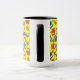 A white Ringer Mug with a black lip and handle and a pattern of cute owls in red, blue, green on a yellow background, which you can easily change by using the edit button. The owl pattern was an original handpainted paper collage design by Judy Adamson.
