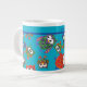A fun, customizable Jumbo-Sized Coffee Mug, with a pattern of cute owls in red, blue, green on a Turquoise Blue background. The owl pattern is from an original handpainted paper collage design by Judy Adamson.