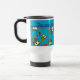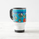 A cool Travel Mug to personalise, with a pattern of cute owls in red, blue, green on a turquoise blue background. The owl pattern is from an original handpainted paper collage design by Judy Adamson.