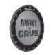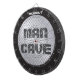 It has a black border and a cool steel diamond plate (tread plate) design in the centre. It has YOUR name up top and reads "Man Cave" in the middle in an awesome masculine font with screw marks!