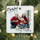 Celebrate your family with this square photo ornament, perfect for any occasion. The front features a large photo, accented with a black doodle swag of pine greenery and hanging ornaments in the top left corner, slightly overlapping the image for a casual hand-drawn look. The top right has space for your family name and the year in a simple black handwritten font, while the bottom right can feature a special phrase in a black script calligraphy style.
