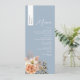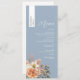Elevate your reception with this personalised wedding menu, featuring elegant dusty blue background, soft peach watercolor florals, and a guest name printed on a vertical strip—perfect for combining a menu with a place card. Ideal for spring, summer, boho, or rustic weddings, this custom menu brings a polished, coordinated touch to your table settings. Matches beautifully with the full Dusty Blue and Peach Floral Wedding Suite.