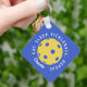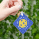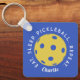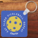 Custom Eat Sleep Repeat Pickleball Keychain features a blue background with a yellow pickleball in the centre of the keychain with the saying "eat sleep repeat pickleball wrapped around the ball. Personalise it with your name or initials in a script font. A great gift for a coach or pickleball enthusiast.