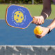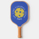 This Custom Eat Sleep Repeat Pickleball Paddle features a blue background with a yellow pickleball in the centre of the keychain with the saying "eat sleep repeat pickleball wrapped around the ball. Personalise it with your name or initials in a script font. A great gift for a coach or pickleball enthusiast.