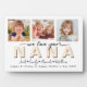 Create a sweet gift for a beloved nana this mother's Day or grandma's birthday, or at the holidays with this three photo collage plaque. "NANA" appears in the centre in soft peach lettering, with your custom message and grandchildren's names overlaid.