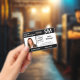 Horizontal custom photo ID badges feature your employee's photo, name, professional job abbreviation and job title, ID number, business logo and name. You can also include a department if you like. Perfect for any profession. On the back you can add more information, such as where to return the badge if it gets lost. Customise it with a photo, any shape logo, and custom text in the sidebar. The square photo on the left has a thin white border surrounded by black stripes across the top and bottom and thin black lines by its sides. A white block on the centre right side highlights the logo, job title, ID number, and expiration date in black text. The staff person's name, job initials, and hospital or business text is white on black.