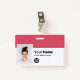 Easily personalise this Custom Employee Name Badge with Photo, Scan Bar Code and business logo, with metal clip included. A simple business design left-aligned in vibrant fuchsia pink and white colours fully customisable in front and back sizes, sans-serif basic and modern fonts and a professional and clear look. Avaiable with or without lanyard, metal clip or with retractable. No minimum order.