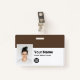 Easily personalise this Custom Employee Name Badge with Photo, Scan Bar Code and business logo, with metal clip included. A simple business design left-aligned in deep dark brown and white colours fully customisable in front and back sizes, sans-serif basic and modern fonts and a professional and clear look. Avaiable with or without lanyard, metal clip or with retractable. No minimum order.