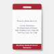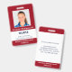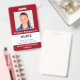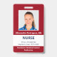 Keep your hospital or medical practice safe with custom photo ID badges featuring your employee's photo, name, job title, and ID number, as well as the business name. You can also include a department if you like. Perfect for a nurse or other staff. On the back you can add more information, such as where to return the badge if it gets lost. Customise it with a photo and custom text in the sidebar. The square photo has a thin white border on a dark red background. A white band near the bottom highlights the job title, ID number, and expiration date in navy blue text. The staff person's name and hospital or business text is white on dark red.