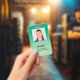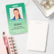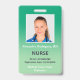 Keep your hospital or medical practice safe with custom photo ID badges featuring your employee's photo, name, job title, and ID number, as well as the business name. You can also include a department if you like. Perfect for a nurse or other staff. On the back you can add more information, such as where to return the badge if it gets lost. Customise it with a photo and custom text in the sidebar. The square photo has a thin white border on a green to light green gradient background. The job title, ID number, and expiration date are in navy blue sans serif text. The staff person's name and hospital or business text is in a white serif font for contrast.